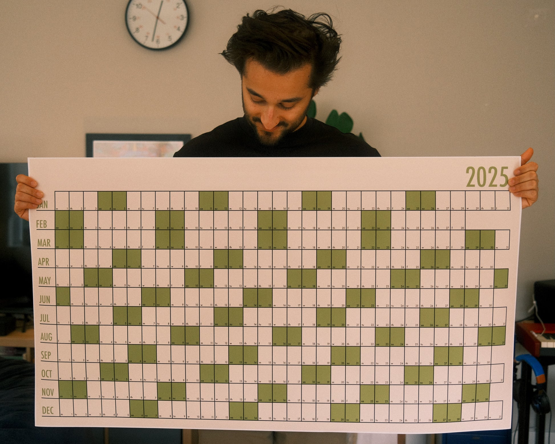 This calendar reads like a book - every line is a month, every box is a day. Also, the weekends are highlighted.